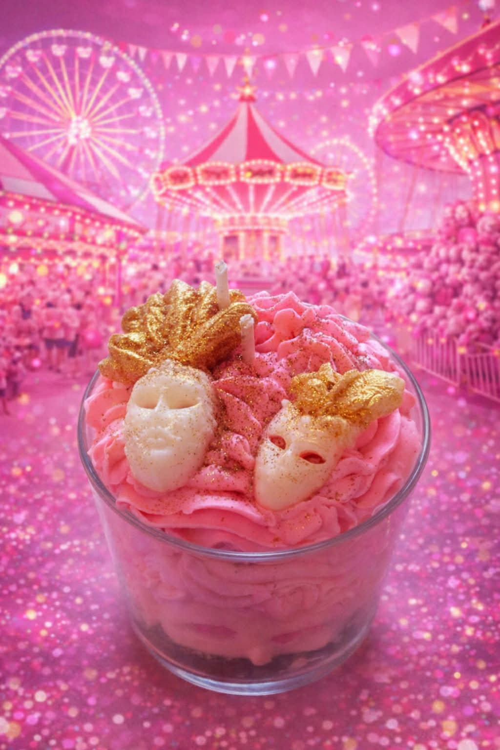 Entièrement réalisée à la main, cette bougie se distingue par sa généreuse chantilly de cire rose, délicatement décorée de masques de carnaval et d’ornements dorés qui rappellent la magie et le glamour des fêtes costumées. Les détails scintillants apportent une touche précieuse et festive à cette création unique.